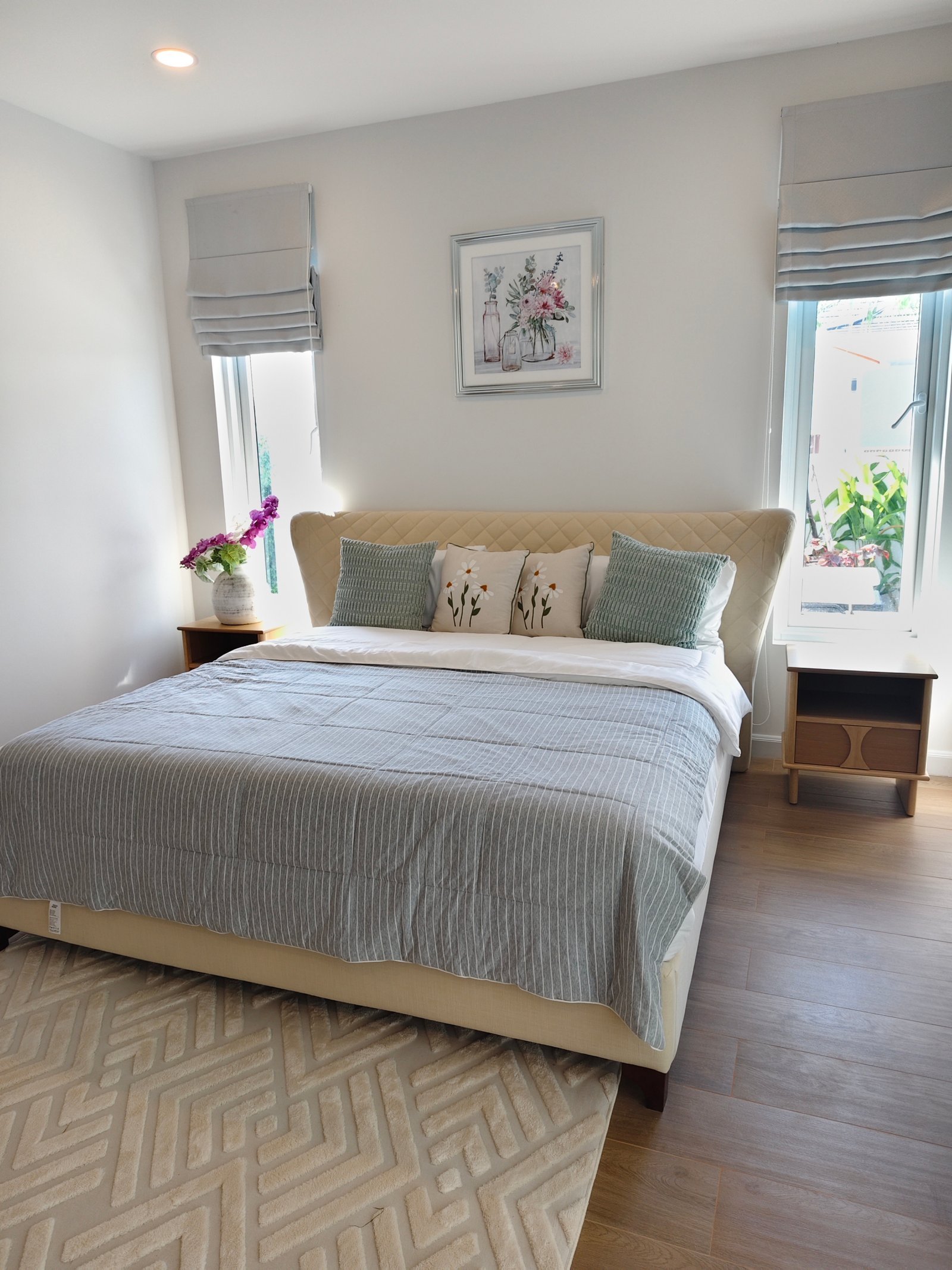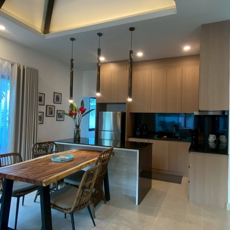 The villa features a bright open-plan living and dining area, designed to maximize space and natural light. A fully equipped European kitchen with modern appliances makes everyday living and entertaining effortless. Large sliding doors open directly onto the private swimming pool and landscaped garden, creating a seamless indoor-outdoor lifestyle.